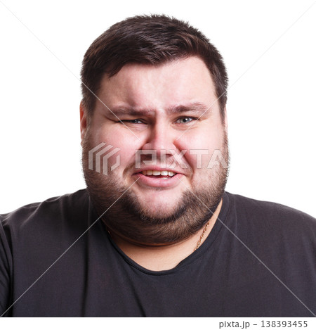 Feeling disgust. Fat man with unpleasant expression on face, negative emotion, white isolated studio background
