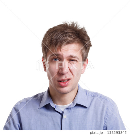 Feeling disgust. Man with unpleasant expression on face, negative emotion, white isolated studio background