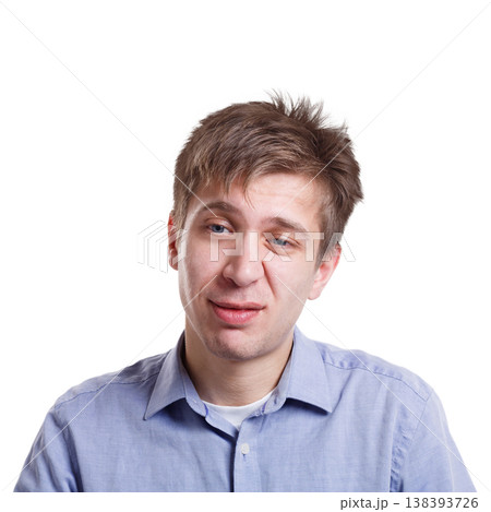 Unpleasant surprise. Negative emotion. Man with disappointed face, grimacing on white studio background, cutout