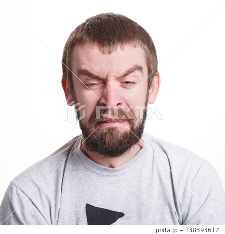 Negative human emotion. Man expressing unpleasant feelings on face, grimacing on white studio background, cutout