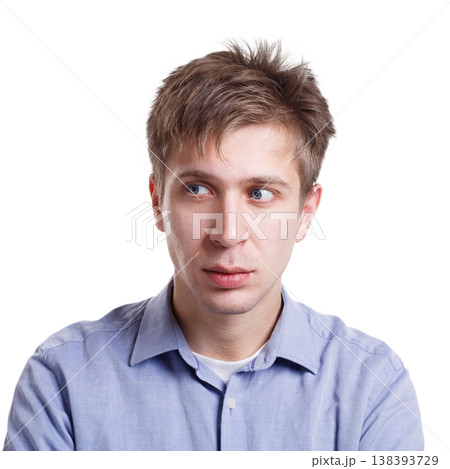 Mistrustful man with sly smile, makes fun of something. Facial expressions, portrait isolated on white