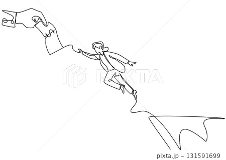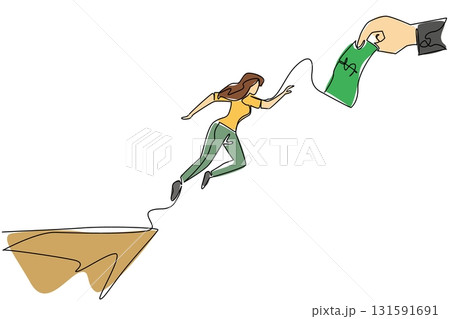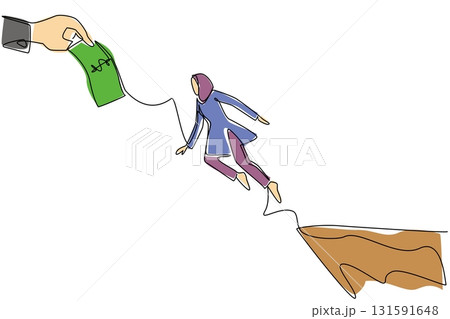 Continuous one line drawing a woman jumps off a cliff trying to reach a big hand holding a dollar bill. Economic trap. National Senior Fraud Awareness Day. Single line draw design vector illustration