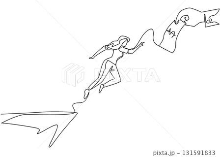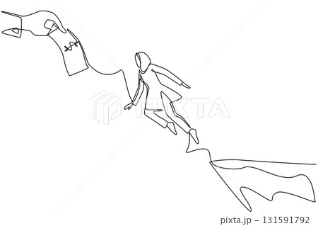Continuous one line drawing an arab woman jumps to reach the big hand holding the dollar bill. Greed. Not profitable. National Senior Fraud Awareness Day. Single line draw design vector illustration
