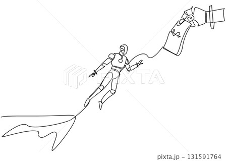 Single one line drawing robot jumps off a cliff trying to reach a big hand holding a dollar bill. System bug. Broken. National Senior Fraud Awareness Day. Continuous line design graphic illustration