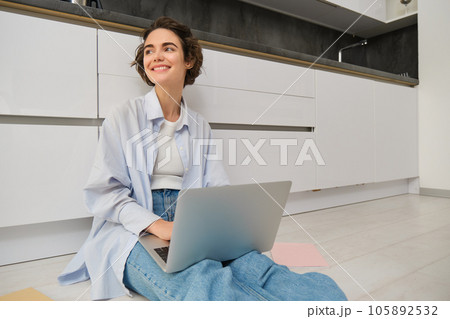Young woman works from home on kitchen floor, does homework on laptop, using internet on computer, freelancing