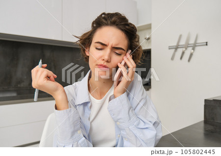Image of woman with confused face, answering phone call and looking puzzled, cant understand conversation, using smartphone