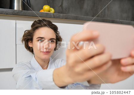 Close up portrait of candid young woman, takes selfie on smartphone, using mobile phone photo app with filters, sits on kitchen floor at home