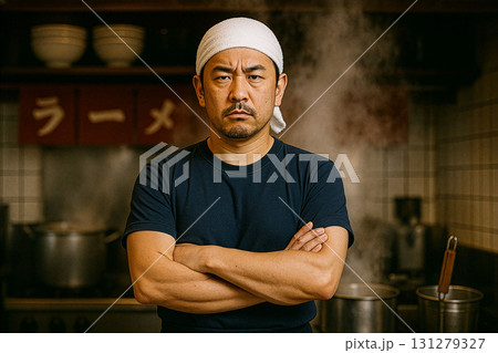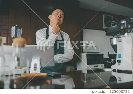 用臉頰棒困擾的姿勢經營餐廳的男人