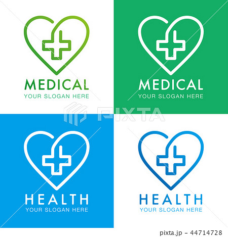 Medical logotype. Pharmacy colored plus cross in a soft shape. Tests, pharmaceutical sign with cardio scheme. Help and health care symbol. Branding identity with cross shape elements.