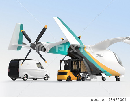 叉車和貨車將包裹裝載到 eVTOL 送貨無人機上的圖像。速度交付概念