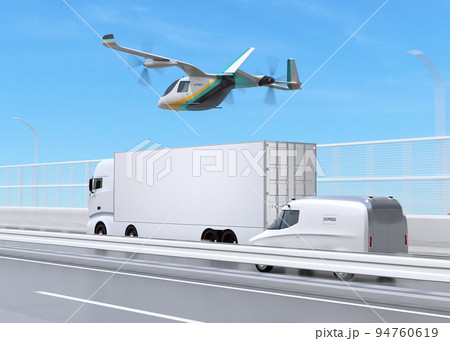 eVTOL 無人機、卡車和送貨車的圖像。速度交付概念