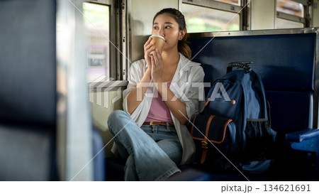 A happy young Asian female tourist is sipping coffee while sitting on a seat in a sky train.