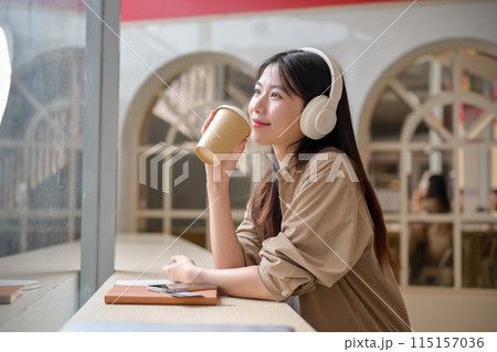 A relaxed Asian woman is daydreaming while sipping coffee and listening to music in a cafe.