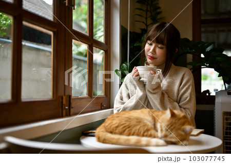 Relaxed young Asian woman sipping tea at a table with her orange cat.
