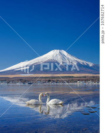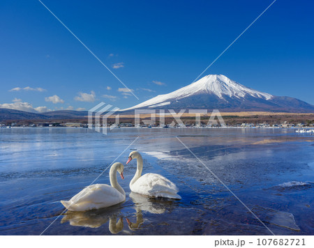 山梨縣山中湖村的富士山、山中湖和疣鼻天鵝