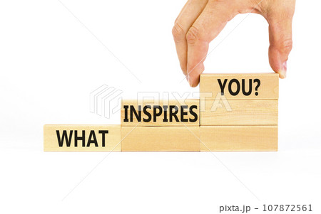 What inspires you symbol. Concept words What inspires you on wooden block. Beautiful white table white background. Businessman hand. Business motivational what inspires you concept. Copy space.