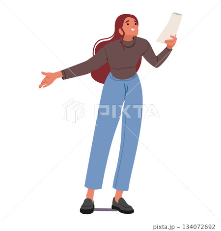 Inspired woman cartoon character reading script playing role at theatrical class isolated on white