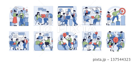 Vector illustration set depicting business collaboration, teamwork, and strategy planning. Scenes include meetings, brainstorming, target setting, and digital discussions with diverse teams.