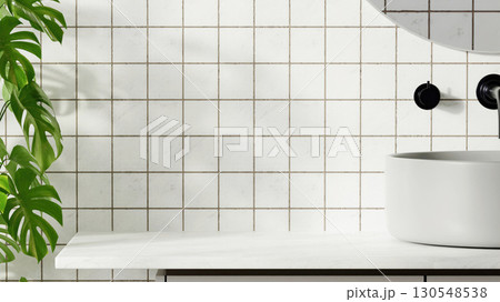 Elegant bathroom sink design with minimalist tile backdrop, 3D render illustration.