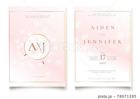 Wedding invitation template in cute peach colors with white transparent fluffy dandelions