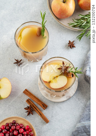 Two glasses of apple cider with cinnamon, anise and rosemary on a light background with fresh fruits