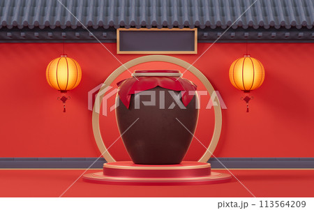 Chinese ancient wine jar with ancient background, 3d rendering.