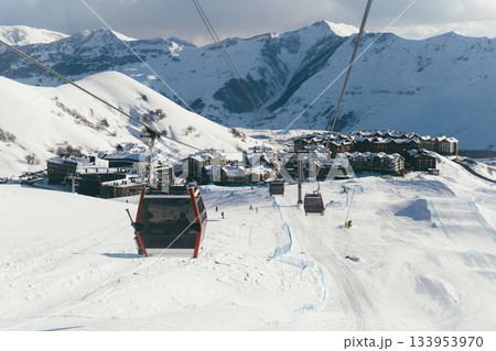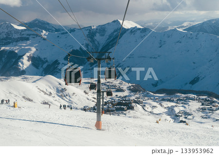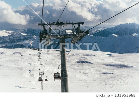 Gondola against snowy Caucasus Mountains, Gudauri