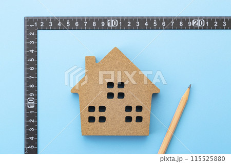 木紋背景上的彎曲尺度與房屋物體