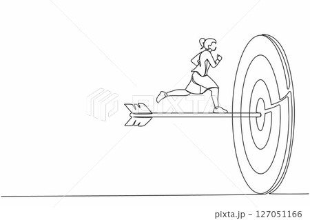 Single continuous line drawing ambition businesswoman run to bullseye with dart. Reach target success. Business metaphor. Successful business concept. One line draw graphic design vector illustration