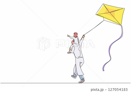 Continuous one line drawing back view Arabian daddy gives happy boy son piggyback ride flying kite outdoors. Father carry son on shoulders and fly kite in countryside. Single line draw design vector