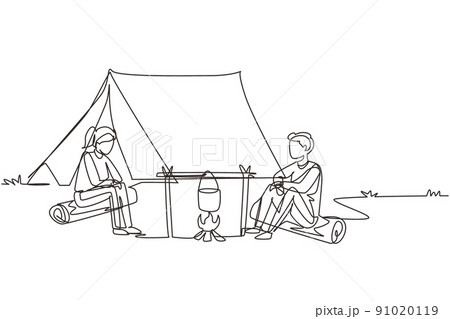 Continuous one line drawing couple man woman hikers sitting on log cooking meals in bowler boiling pot at campfire near camp tent camping nature mountains. Single line draw design vector illustration