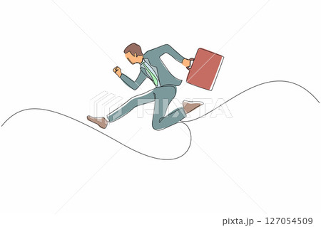 Continuous one line drawing young worker guy jumping to show his success. Business man wearing suit, carrying briefcase is jump from point to point on white background. Single line draw design vector