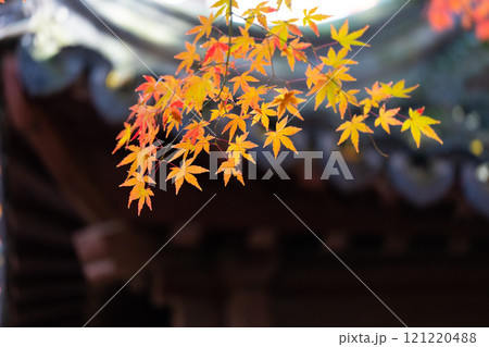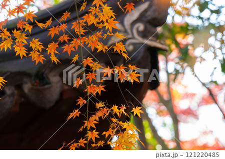 上海公園裡屋簷下的紅色楓葉