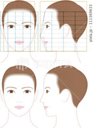 給人溫柔印象的女性的側面和正面。臉部比例插畫
