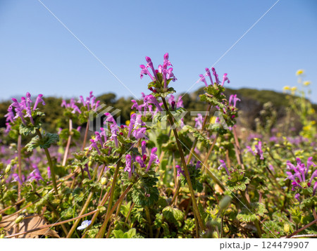 天然植物:一種唇形的小花,似乎屬於唇形科。十月的休耕田野