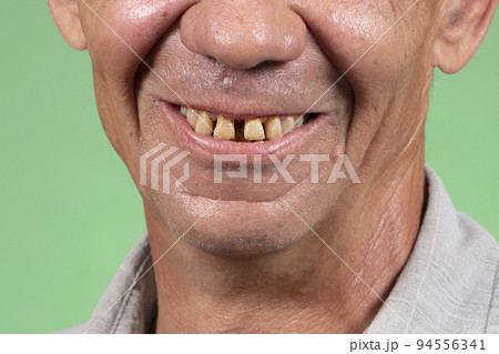 Close up,Mouth of old elderly with chipped a tooth,show a loose broken tooth,smile with bad yellow teeth,plaque tartar from eating tea,coffee and smoking of senior woman,toothache,bad breath problems