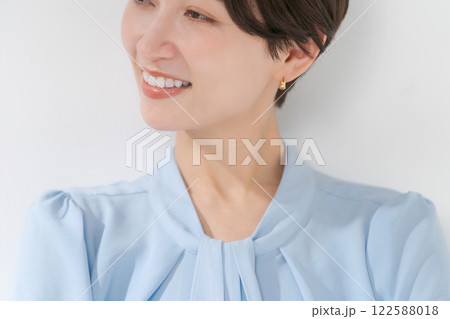 從正面看到的女孩的臉。有瀏海,戴洗臉頭帶,露出額頭的髮型。