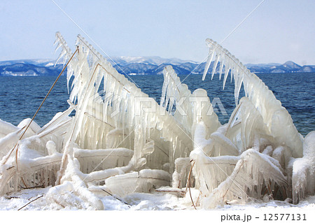 這是一個不尋常的現象和豬苗代湖的冰,冬季的表面沒有凍結,波浪噴霧變成了像冰雕一樣美麗的形狀