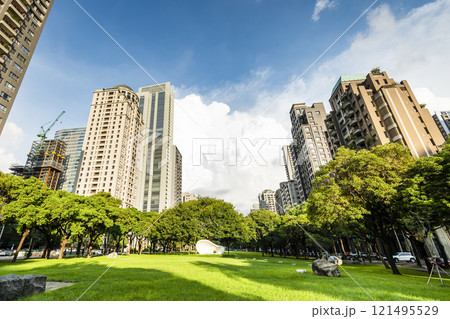 Low-angle view of green park space and modern buildings on both sides in downtown Taichung, Taiwan, It is near the National Taichung Theater.