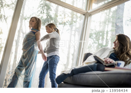Two girls standing in a living room, dressing up, a woman sitting on a sofa, watching.