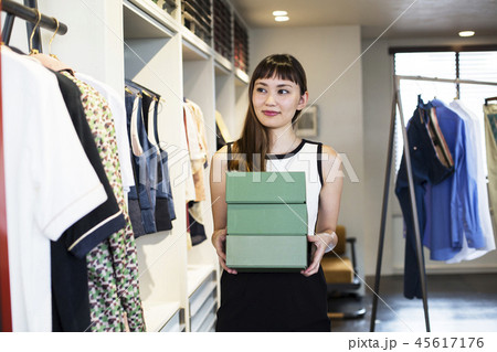 Black female holding cardboard box and standing in front of loading dock doors in a new empty warehouse.