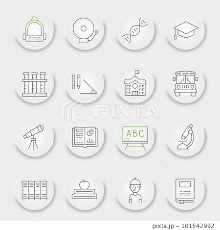 School line icon set, education symbols collection, vector sketches, neumorphic UI UX buttons, back to school icons, knowledge signs linear pictograms, editable stroke
