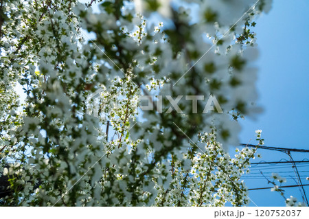 [櫻花暴風雪素材]野平地區的一棵櫻花樹和白雪皚皚的北阿爾卑斯山[長野縣]