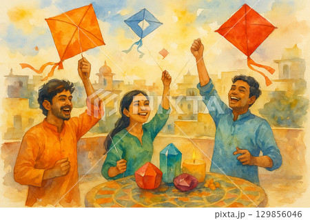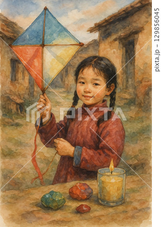 水彩畫 | 中國農村的小女孩、一架風箏、一個彩色石頭頭和一支蠟燭