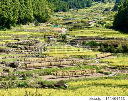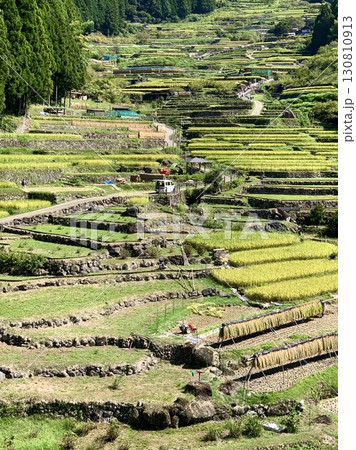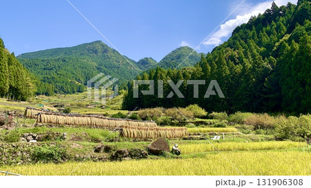 開始收割(水稻收割和曬乾)的梯田[四谷千舞田/愛知縣新城市]