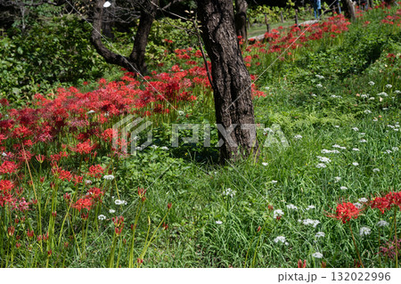 滋賀縣高島市琵琶湖畔的桂濱公園,秋季盛開的石蒜花