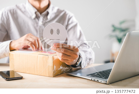 Satisfaction customer experience, person providing feedback for online shopping delivery service, holding neutral face icon above box, illustrating concept for reputation survey review