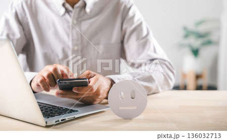 Neutral customer feedback, satisfaction survey, service quality icon visible on desk, person uses smartphone for evaluation