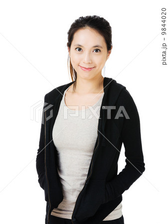 Portrait of happy child, girl in pink winter coat expressing happiness, posing with tongue sticking out against yellow studio background