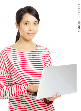 Portrait of happy cute woman with brown hair in checkered casual shirt standing holding laptop with blank screen and smiling at camera, place for ad. indoor studio shot isolated on orange background